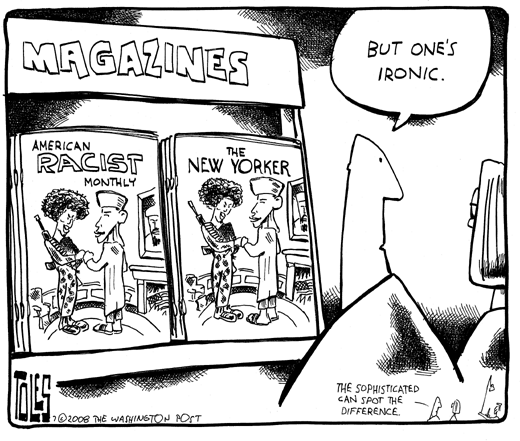 Philip Kennicott has a more interesting take on this same general idea over at the Washington Post. Agreeing with Dowd that Obama may be a bit too prissy in his response to the cover, he goes further and links it to the particular aura of printed material in comparison to our video-oriented imagination. Satire lives, but only in the bawdy possibilities of the moving image.